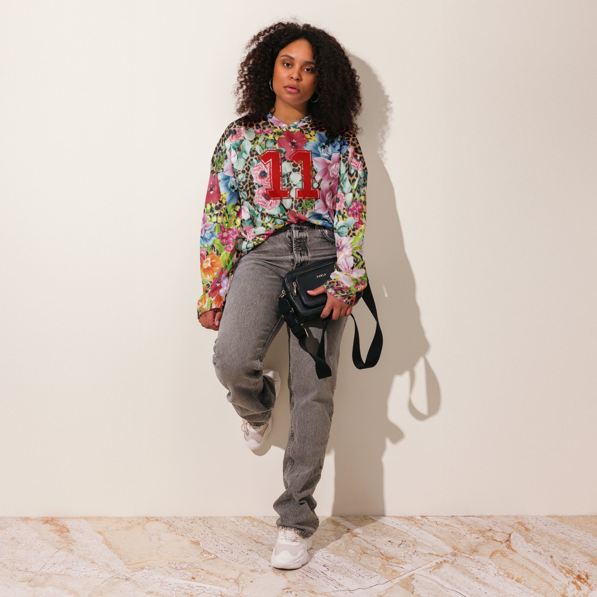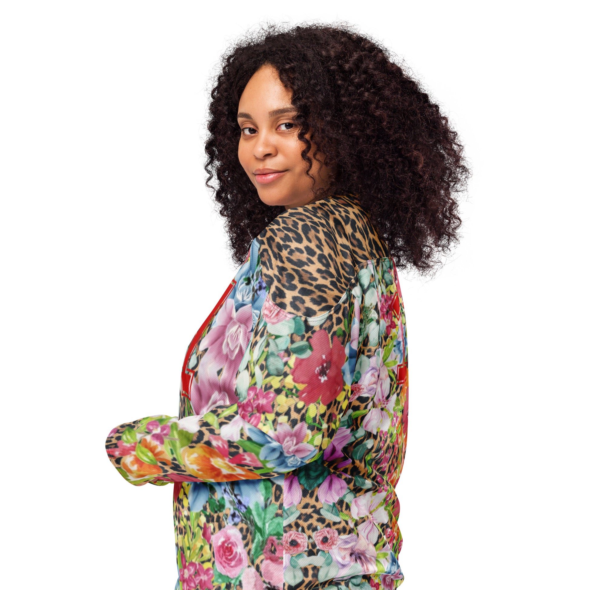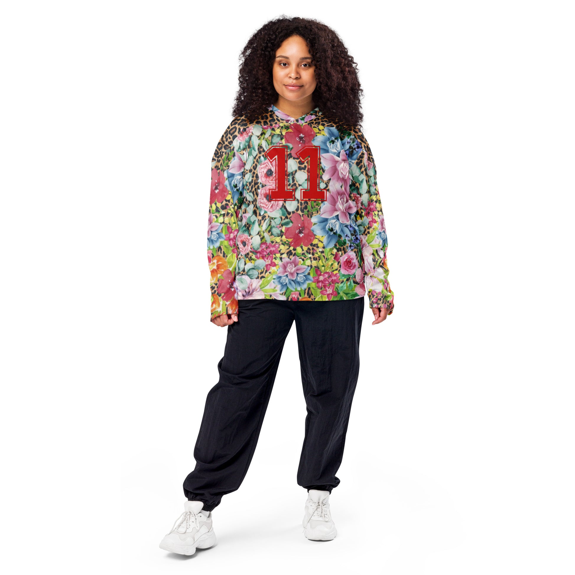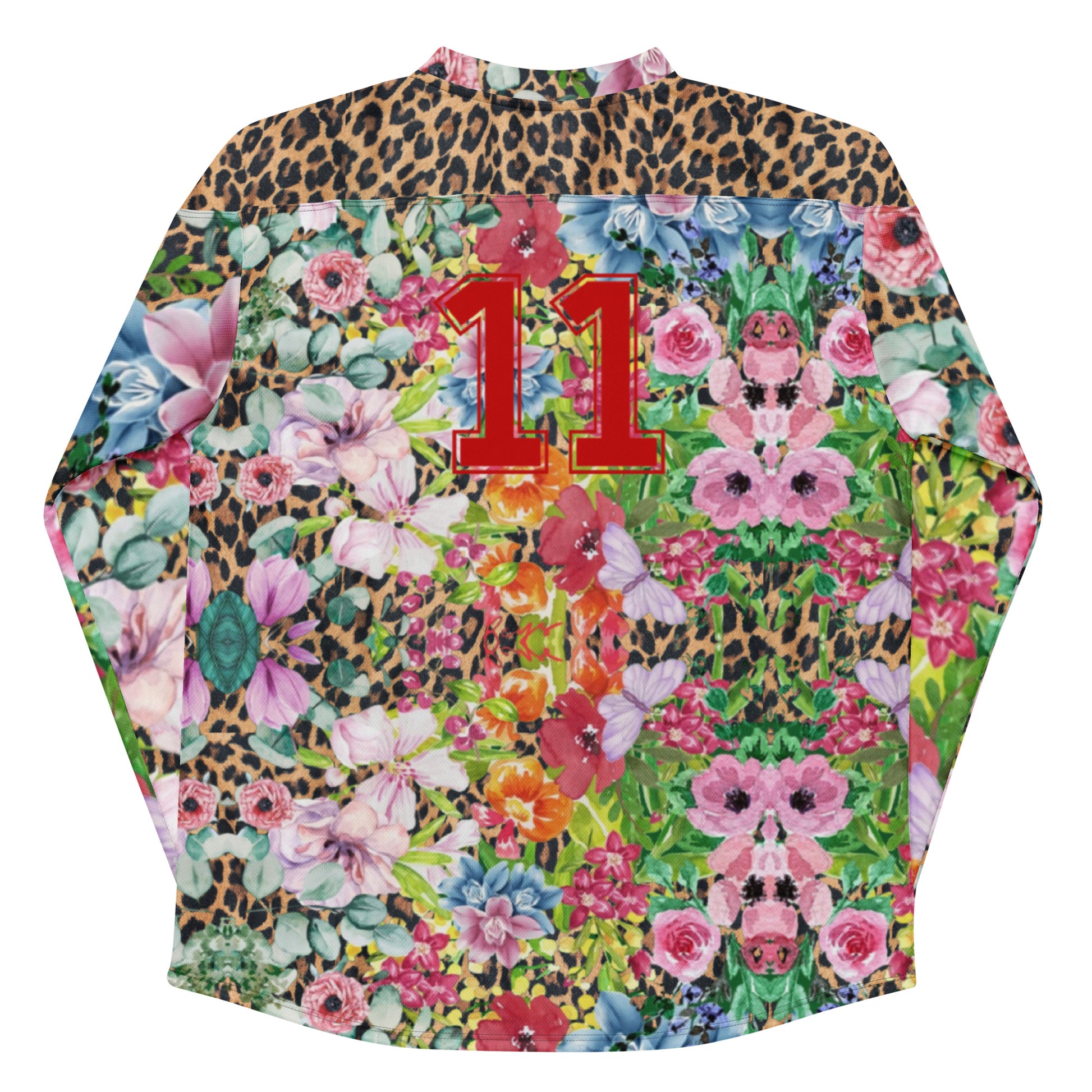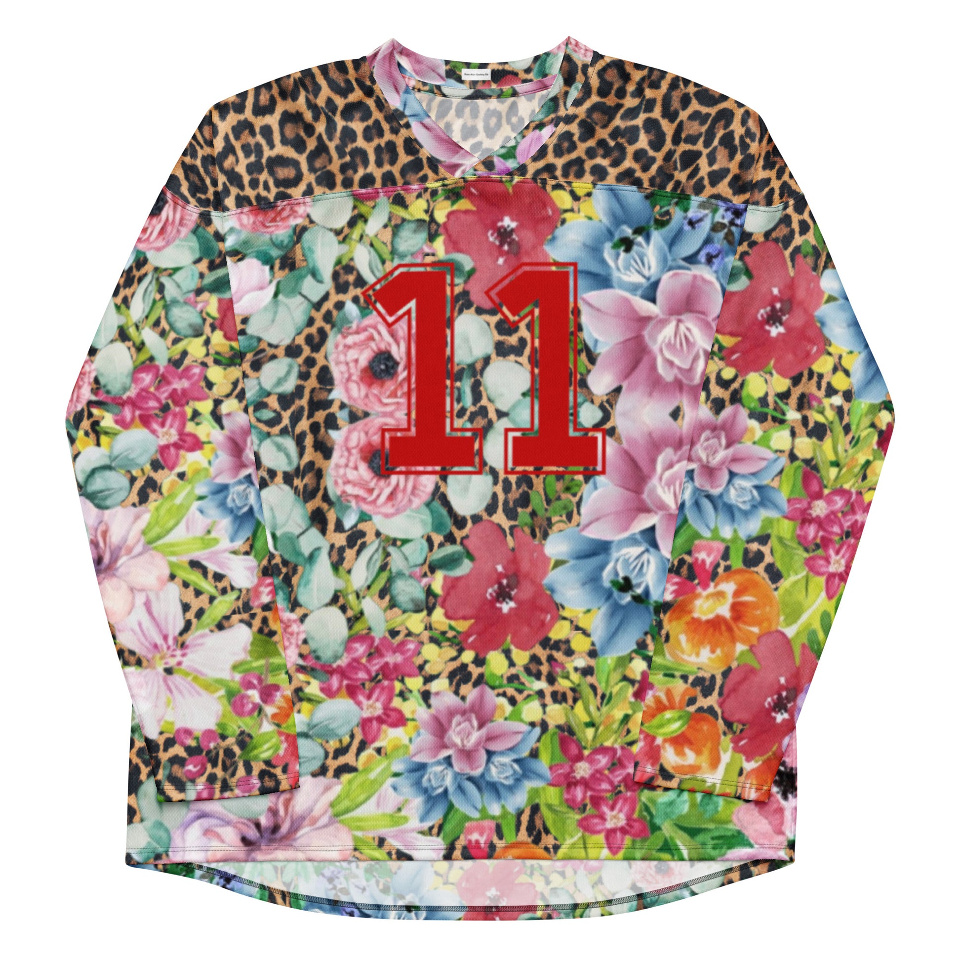 Introducing Bella, the ultimate statement piece for your rave wardrobe! This unisex hockey jersey combines bold, eye-catching leopard print with soft floral accents for a truly unique contrast. The number 11 in vibrant red is featured on both the front and back, adding a sporty edge to your rave-ready look. With its relaxed fit, lightweight fabric, and breathable mesh panels, Bella is designed for comfort while keeping you stylish all night long.