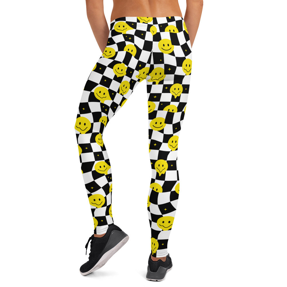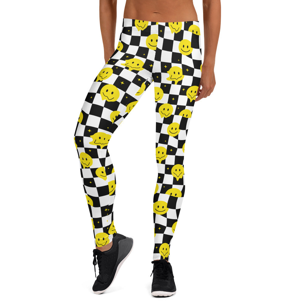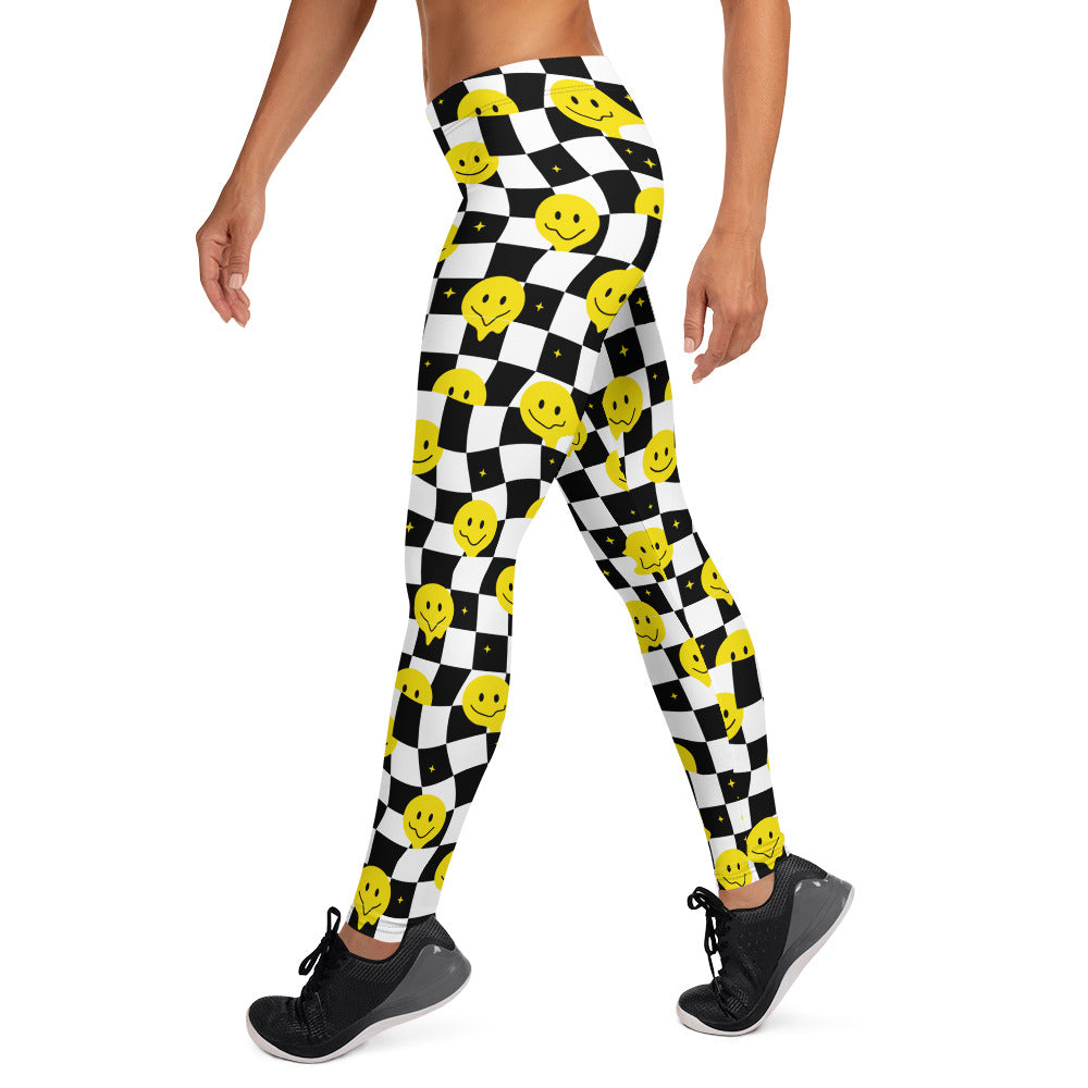 Step into festival mode with the Nicole Leggings, designed with a trippy black-and-white checkerboard pattern and bold melted yellow smiley faces that’ll have all eyes on you! These high-waisted leggings offer a flattering, secure fit that lets you move freely, whether you’re grooving on the dance floor or lounging with friends. Pair them with the matching Nicole Crop Top for a head-turning, coordinated look that screams fun and fearless vibes!