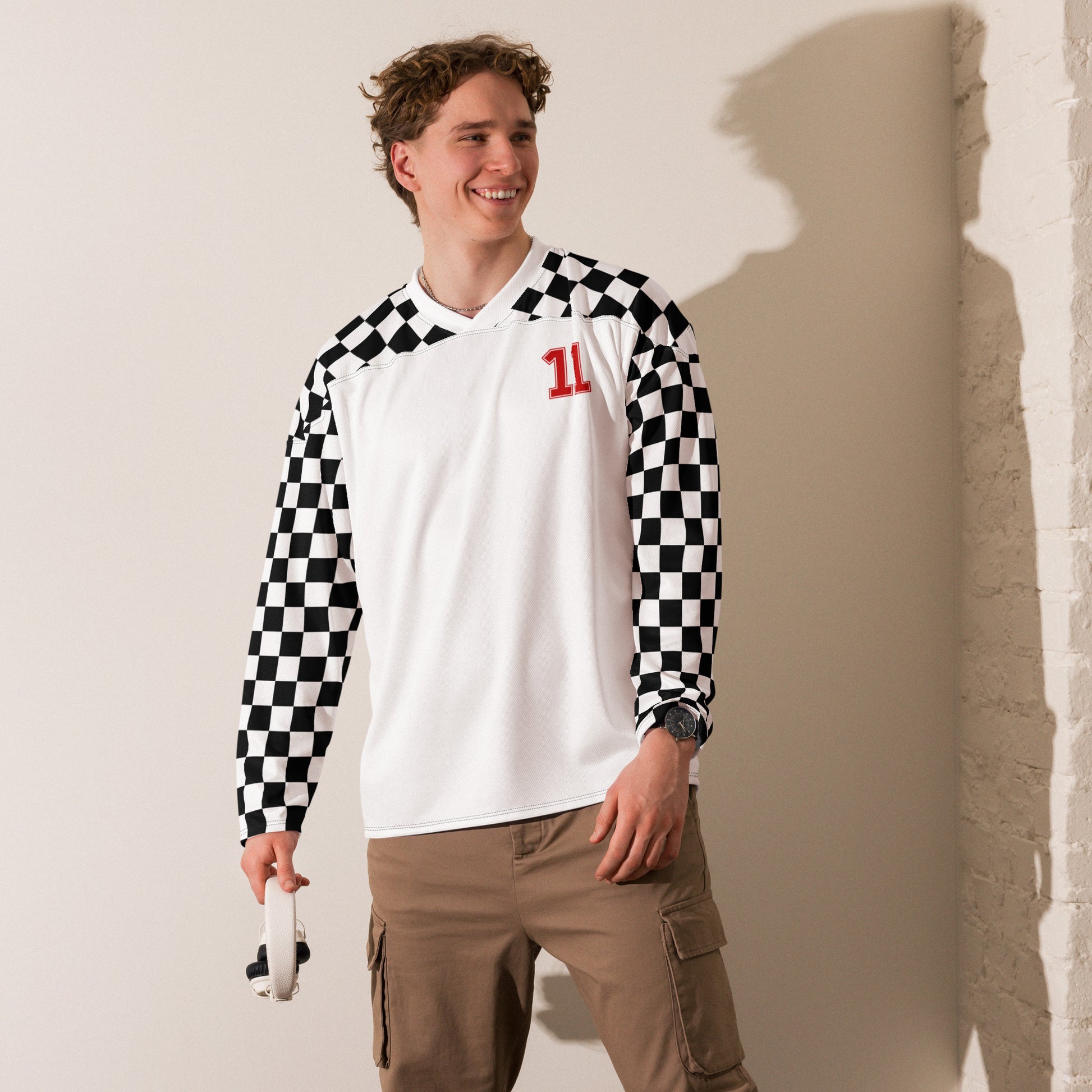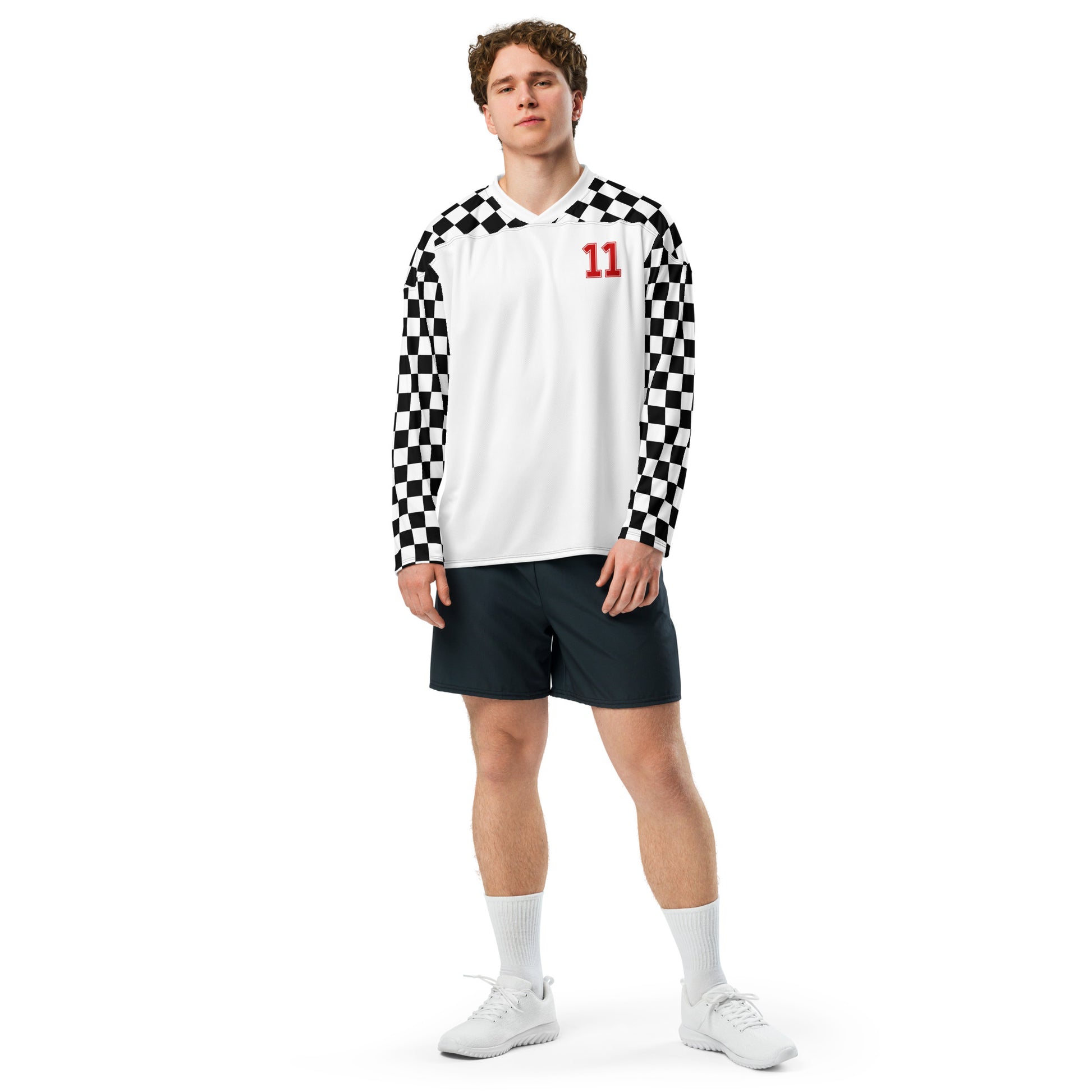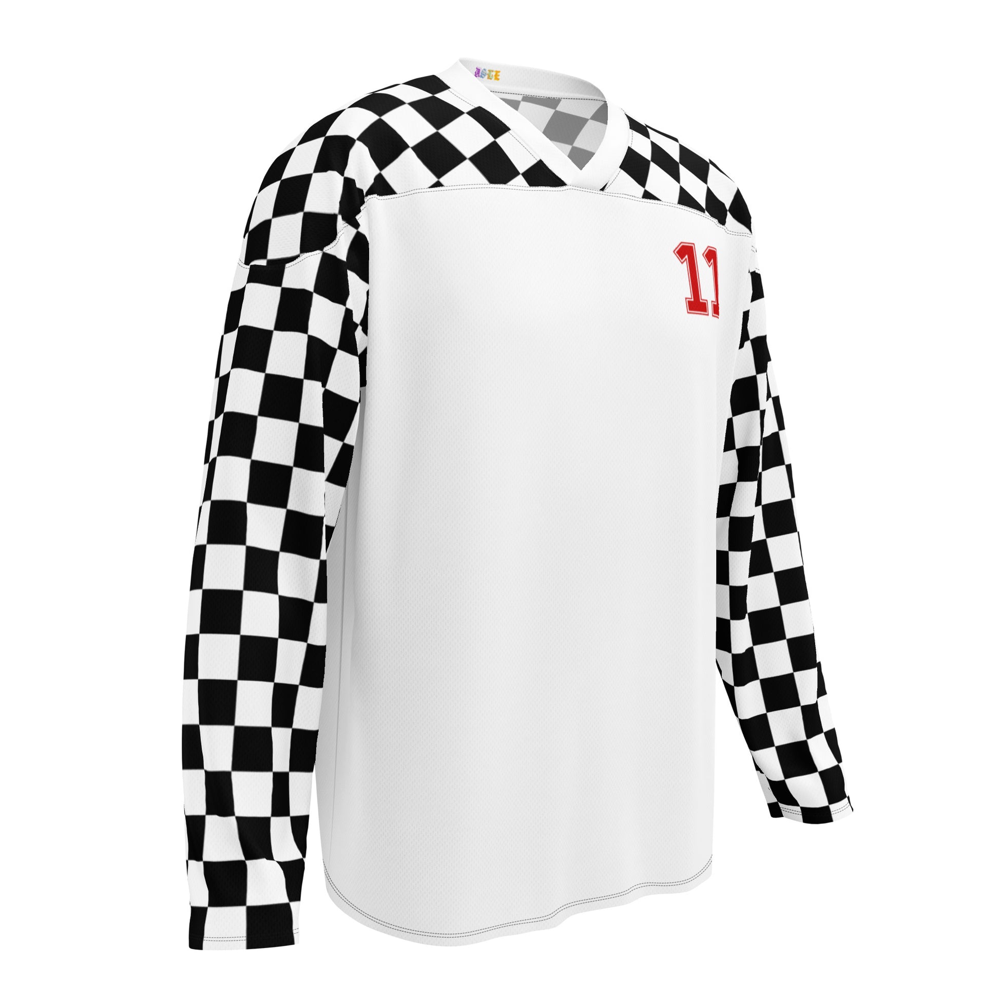 Get ready to turn heads at the next rave with the Frankie Hockey Fan Jersey, a unique blend of sporty and festival flair. This striking jersey features a bold black and white checkered pattern on the sleeves, creating an eye-catching contrast against the crisp white body. The standout red number 11 on the front adds an energetic pop, perfect for expressing your vibrant personality on the dance floor.