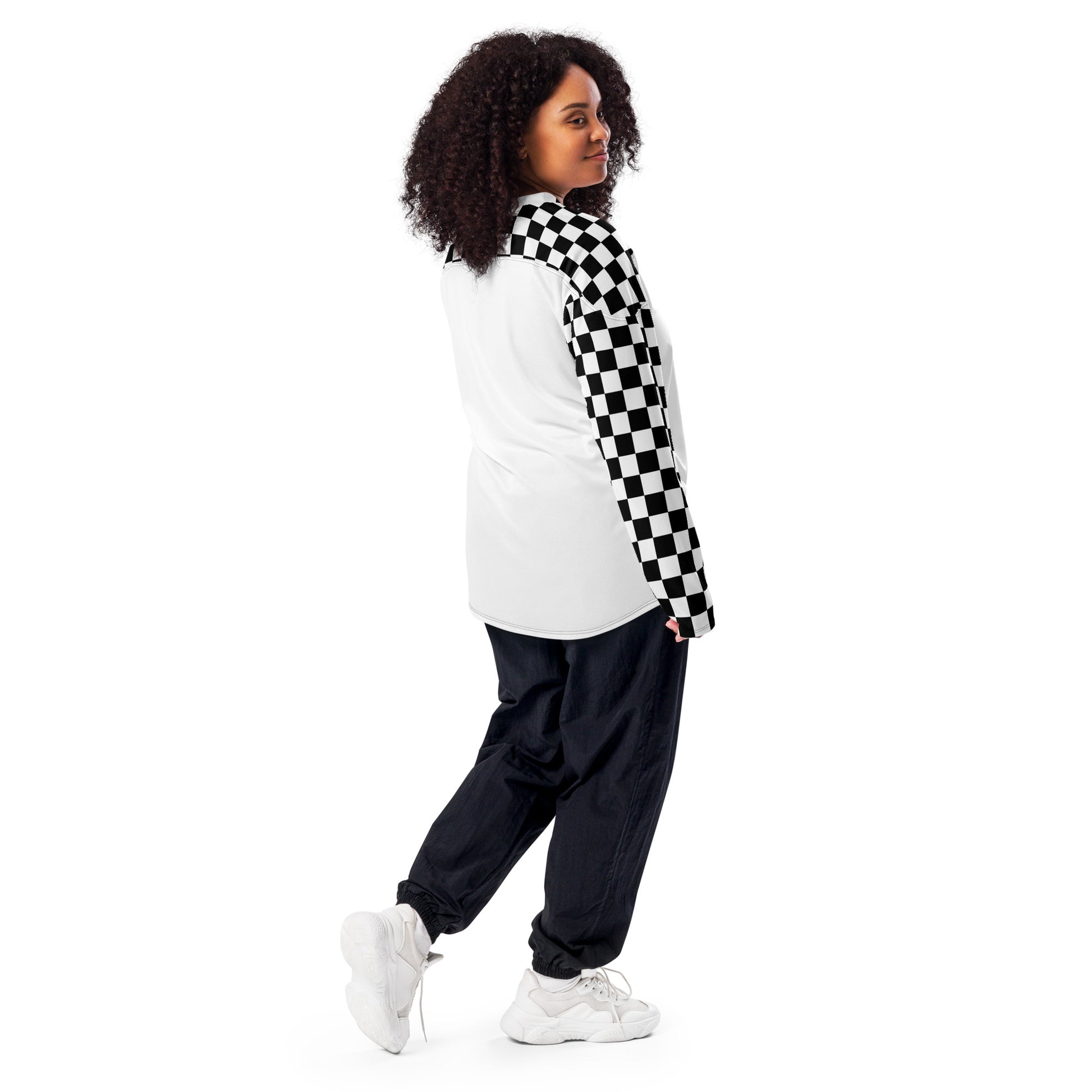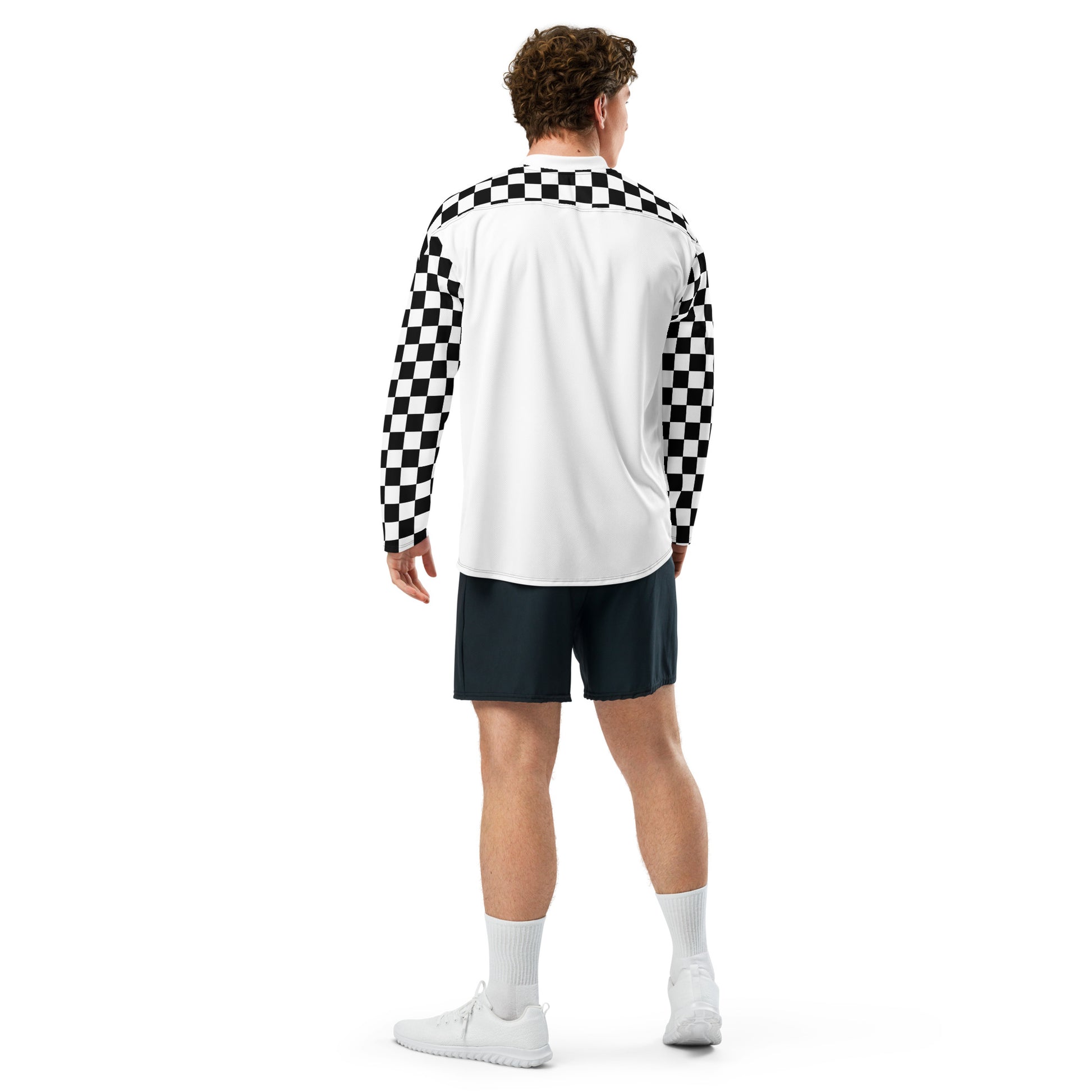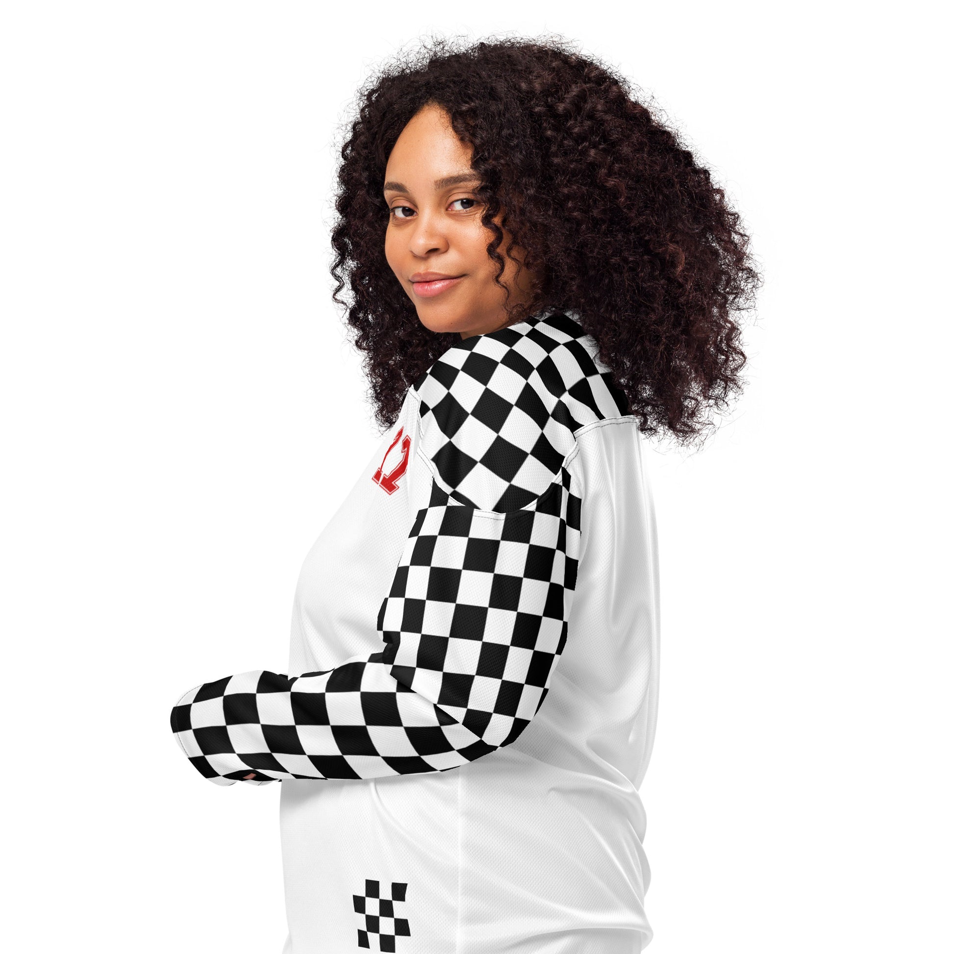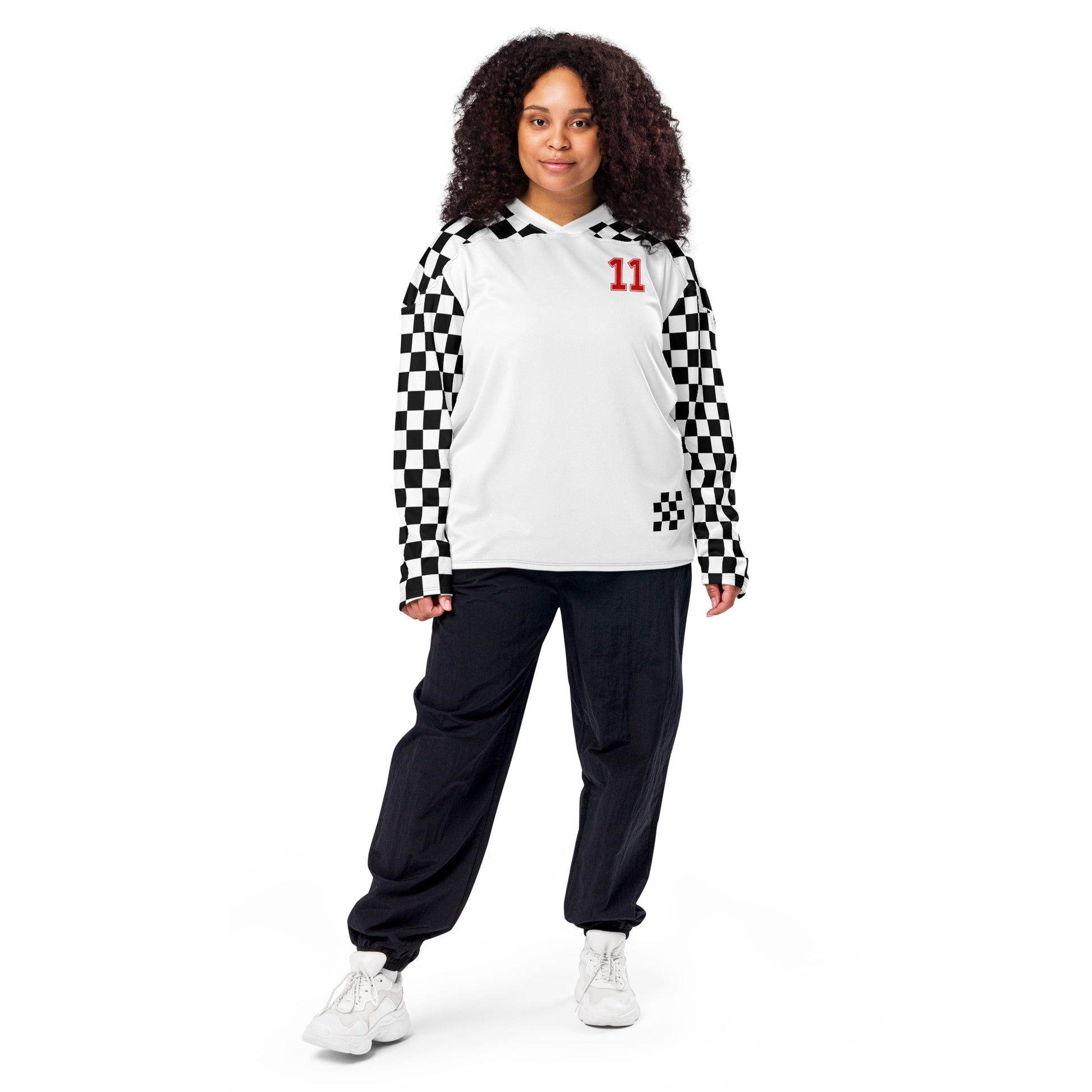 Get ready to turn heads at the next rave with the Frankie Hockey Fan Jersey, a unique blend of sporty and festival flair. This striking jersey features a bold black and white checkered pattern on the sleeves, creating an eye-catching contrast against the crisp white body. The standout red number 11 on the front adds an energetic pop, perfect for expressing your vibrant personality on the dance floor.