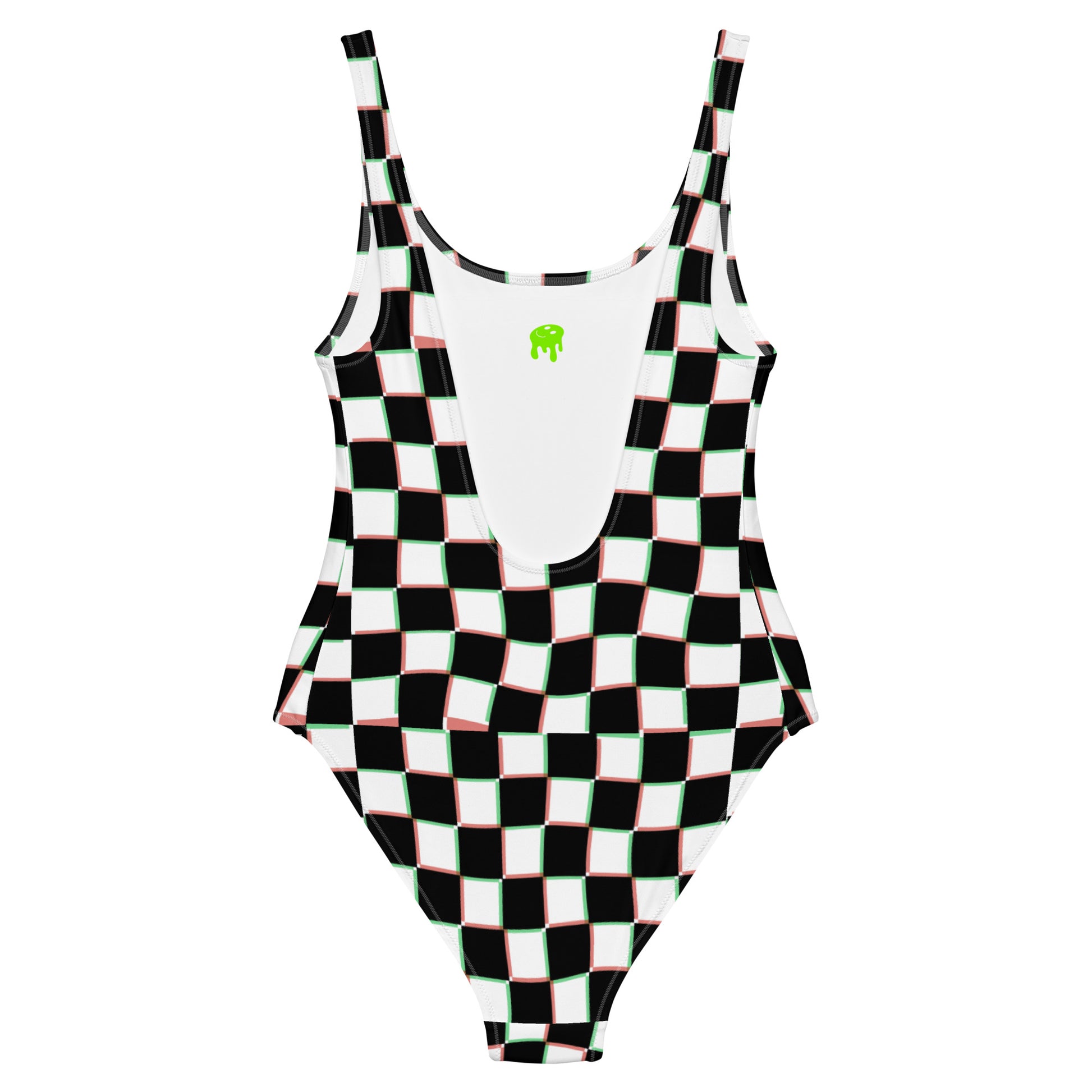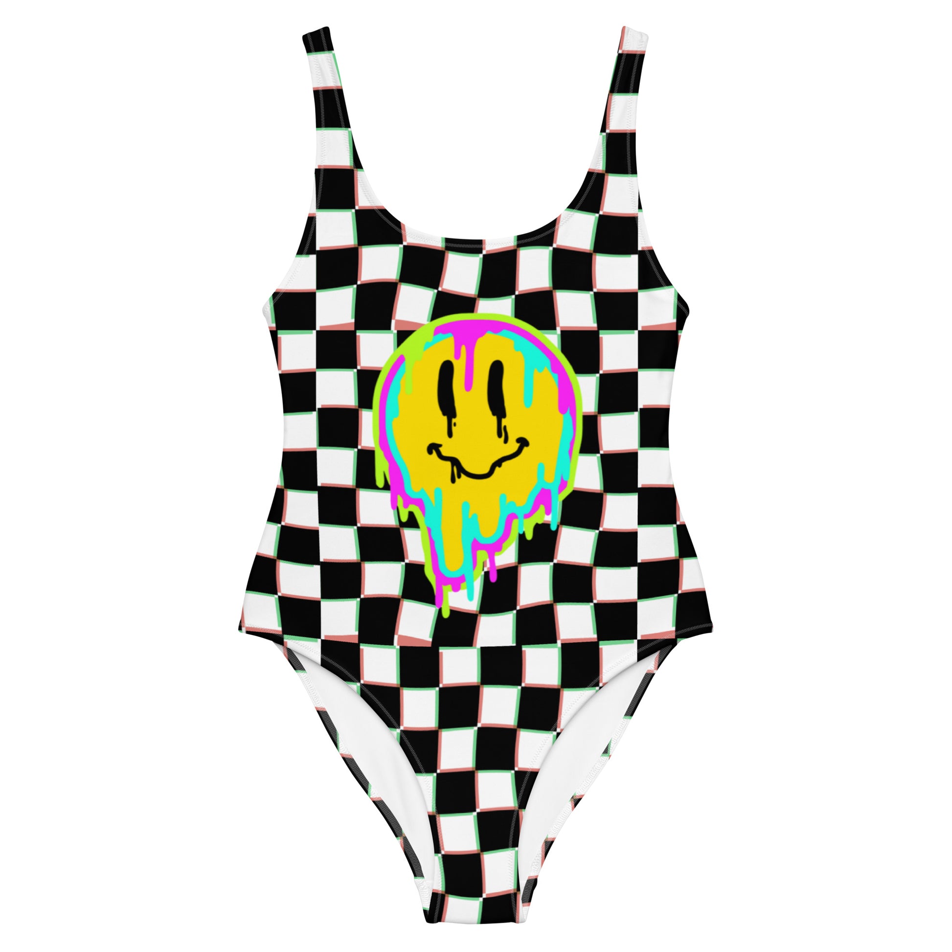 Dive into style with the Maddie One-Piece Swimsuit, the ultimate blend of playful and chic for all your summer adventures! This eye-catching swimsuit features a bold black and white checkerboard pattern that’s perfect for making a statement by the pool or at the beach. Adding a fun twist, the melting :-) graphic on the front captures a carefree, whimsical vibe that’s sure to turn heads and spark smiles wherever you go.